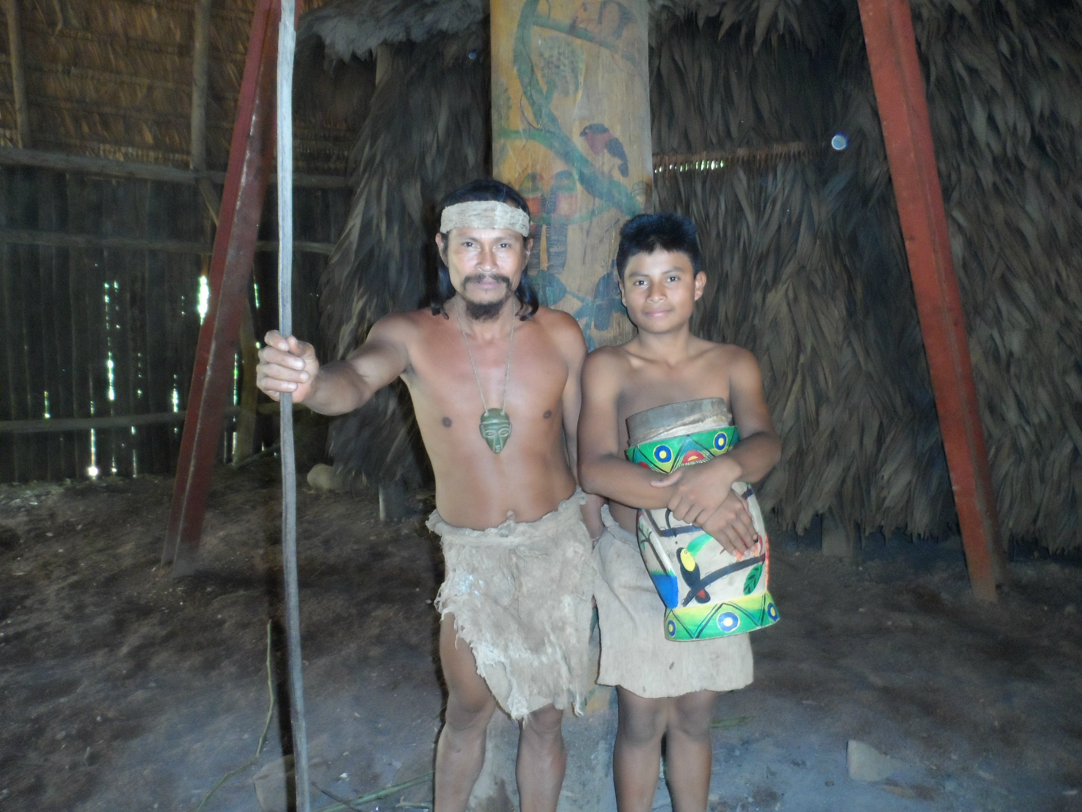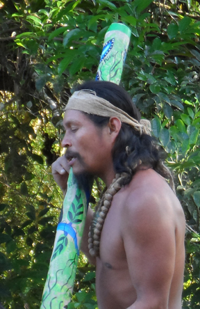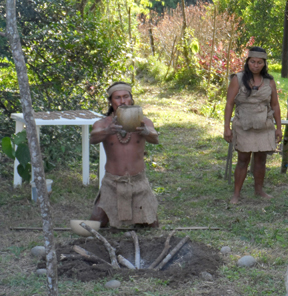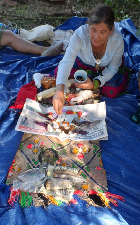 This ceremony was conducted by Makeku shaman Majima, a multi-generational shaman who started studying the sacred path under his father, who was also a fully-vested shaman, when he was six years old (he is now 44 years old). He continues to study the traditional sacred path (a lifelong journey) and he is currently teaching his sons the sacred traditions. He is also a tribal leader and his official residence is in a traditional Maleku ceremonial roundhouse. The roundhouse is 60 ft tall and is held up by a central post decorated with a world tree. The four directions are marked by additional supporting posts. The ceremony at our Lake Arenal site began by burning sacred wood in the fire pit, (called the poh). There were be two tables of offerings. The first table held five local plants that are sacred to the Maleku.